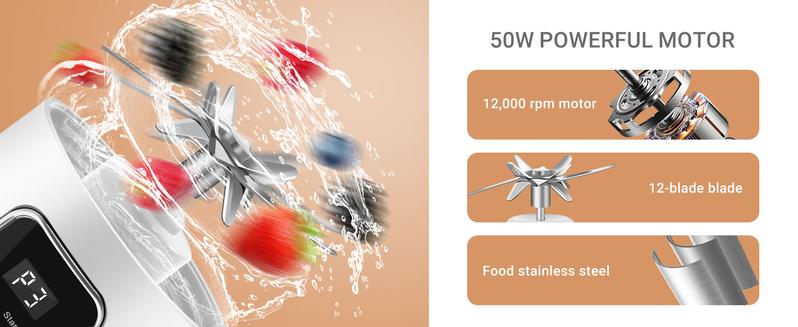 Portable Blender,Usb-C Rechargeable,Personal Compact Travel Juicer Cup 500ML for Shakes, Smoothies,Fresh Juice,Self-Cleaning,Leakproof Lid, Smart Time Display,12 Blades,With Strong Blending White
